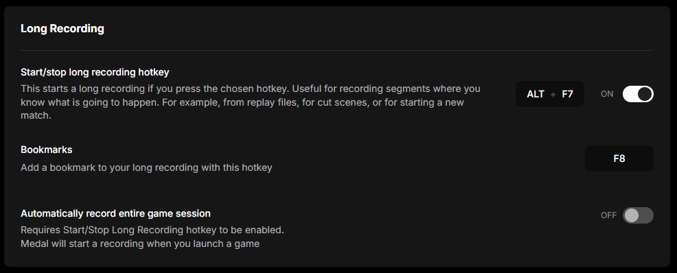 With Long Recording, you can capture your entire gaming session and create clips from within that session. There is no limit on how long Medal will record your gaming session. Once your gaming session is finished, you can trim your session to clips for uploading and sharing!