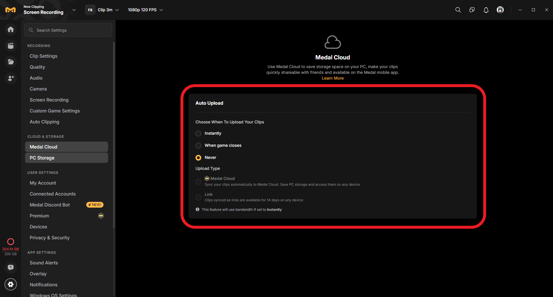 - Go to Medal's Settings > Cloud & Storage > Medal Cloud, alternatively you can search for Auto Upload in the top left.